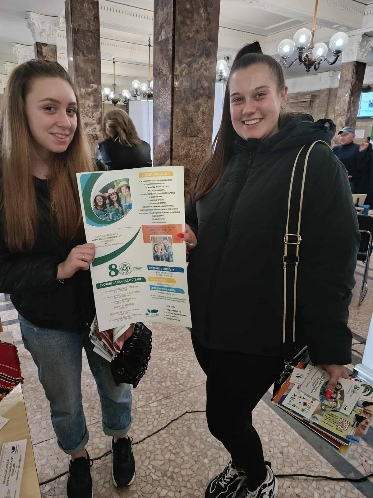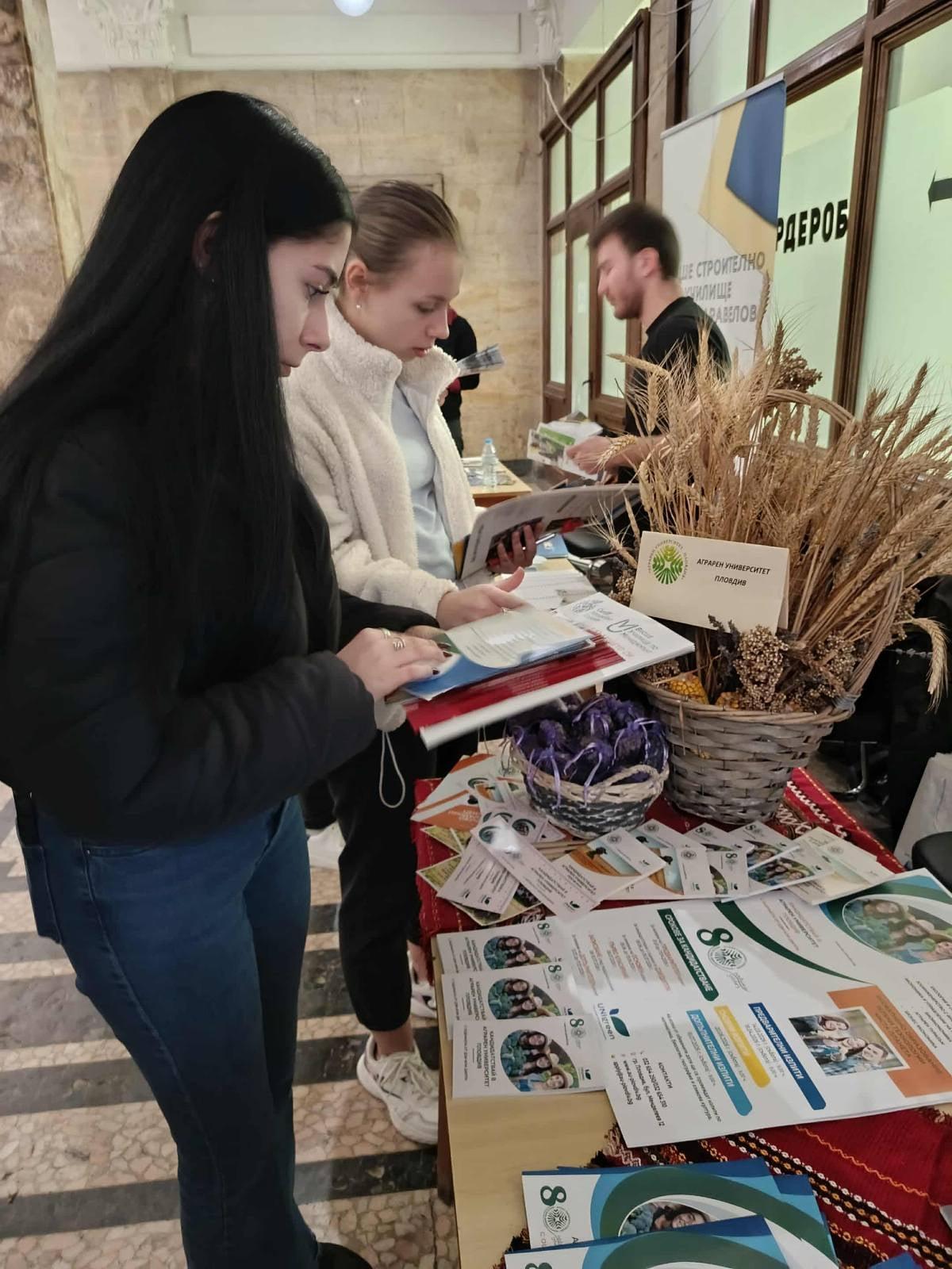 Аграрният университет бе представен от гл. ас. д-р Йордан Йорданов и гл. експерт Надя Кировска, които запознаха учениците с широките възможности за обучение, които предлага университета, както и с актуалните условия за кандидатстване за академичната 2026/2027 година.