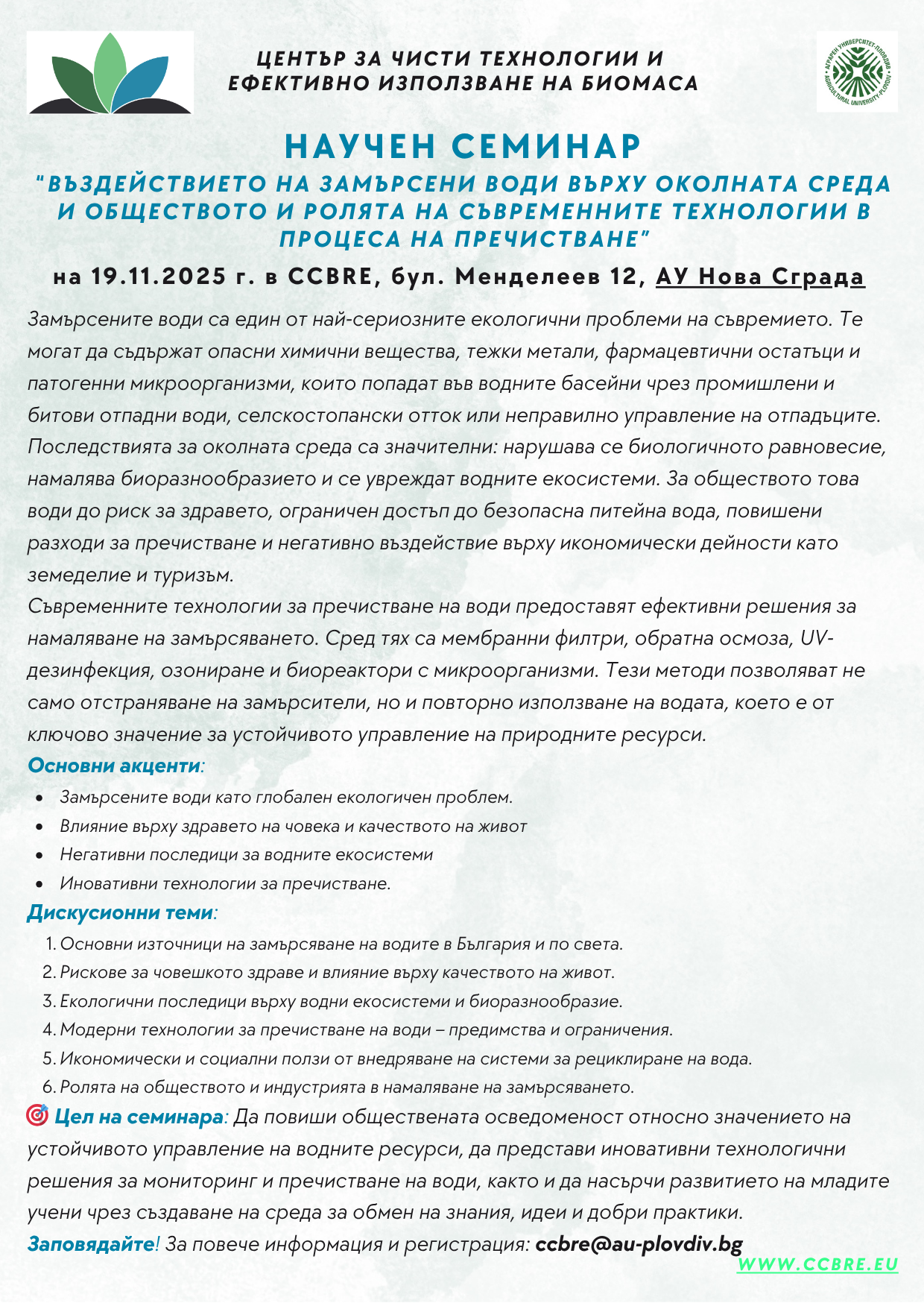 Центърът за чисти технологии и ресурсна ефективност на биомасата организира семинар на тема: „Въздействието на замърсени води върху околната среда и обществото и ролята на съвременните технологии в процеса на пречистване“.