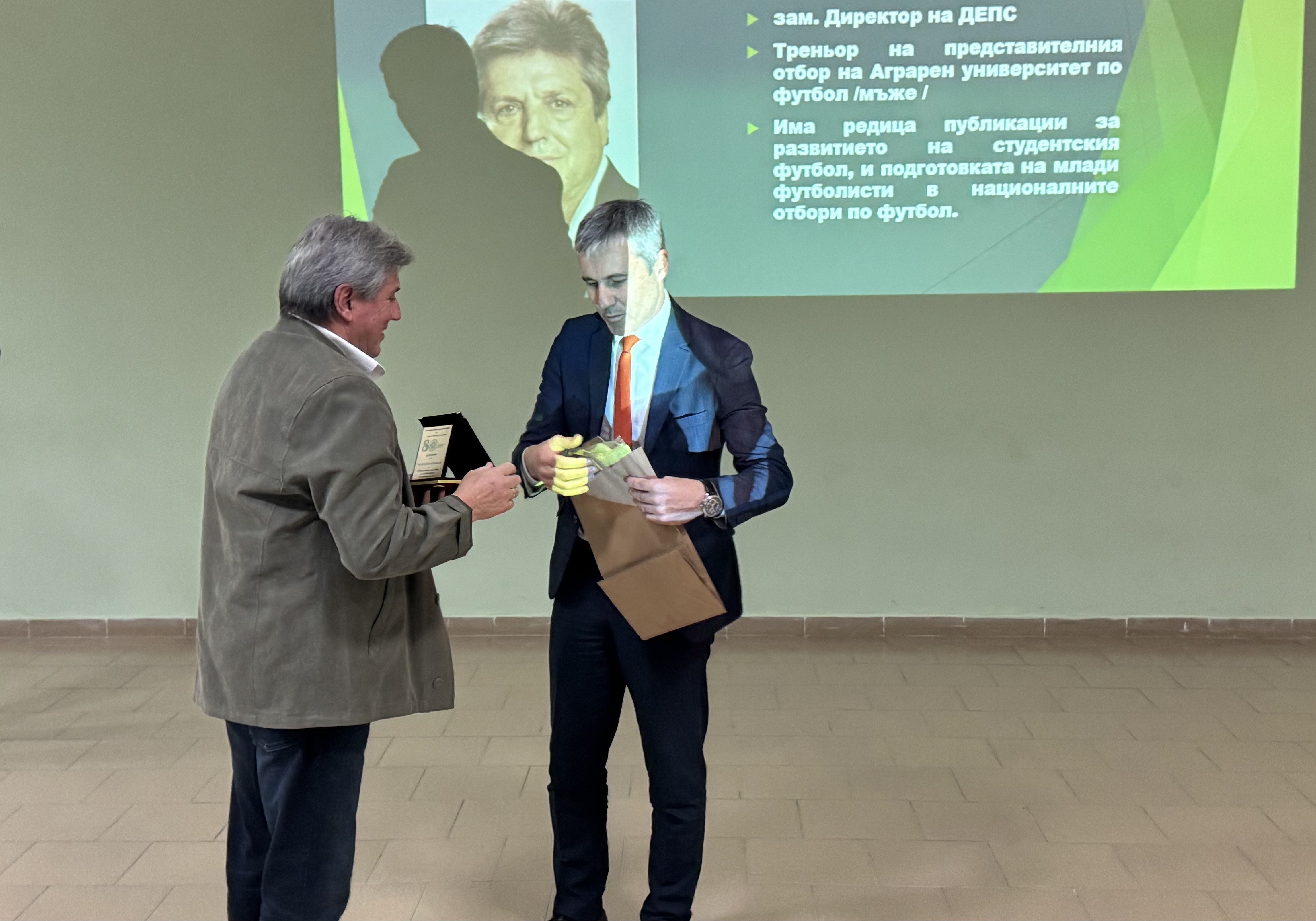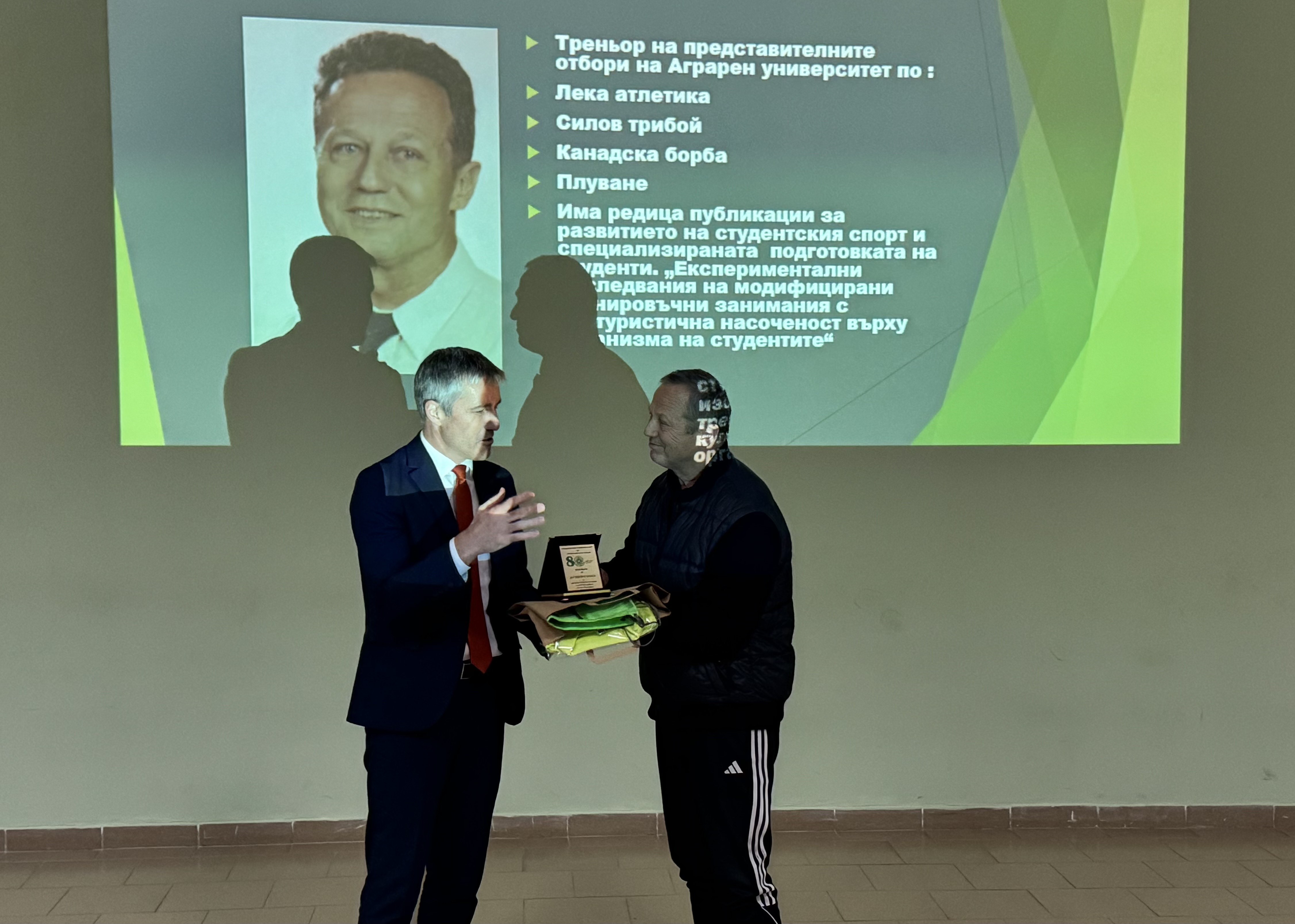 По повод 80-годишнината на институцията зам.-ректорът по научна и международна дейност проф. д-р Димо Атанасов връчи плакети за цялостен принос към спорта и спортната наука на доц. д-р Сандю Бешев, доц. д-р Ангел Иванов, Любослав Атанасов и д-р Ивайло Илиев.
