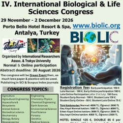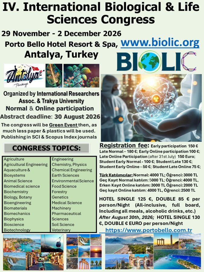The Fourth International Biological and Life Sciences Congress (BIOLIC) will be held from November 29 to December 2, 2026, in Antalya, Turkey. The event will take place at the Porto Bello Resort Hotel & Spa and will also offer online participation, enabling broader international attendance.