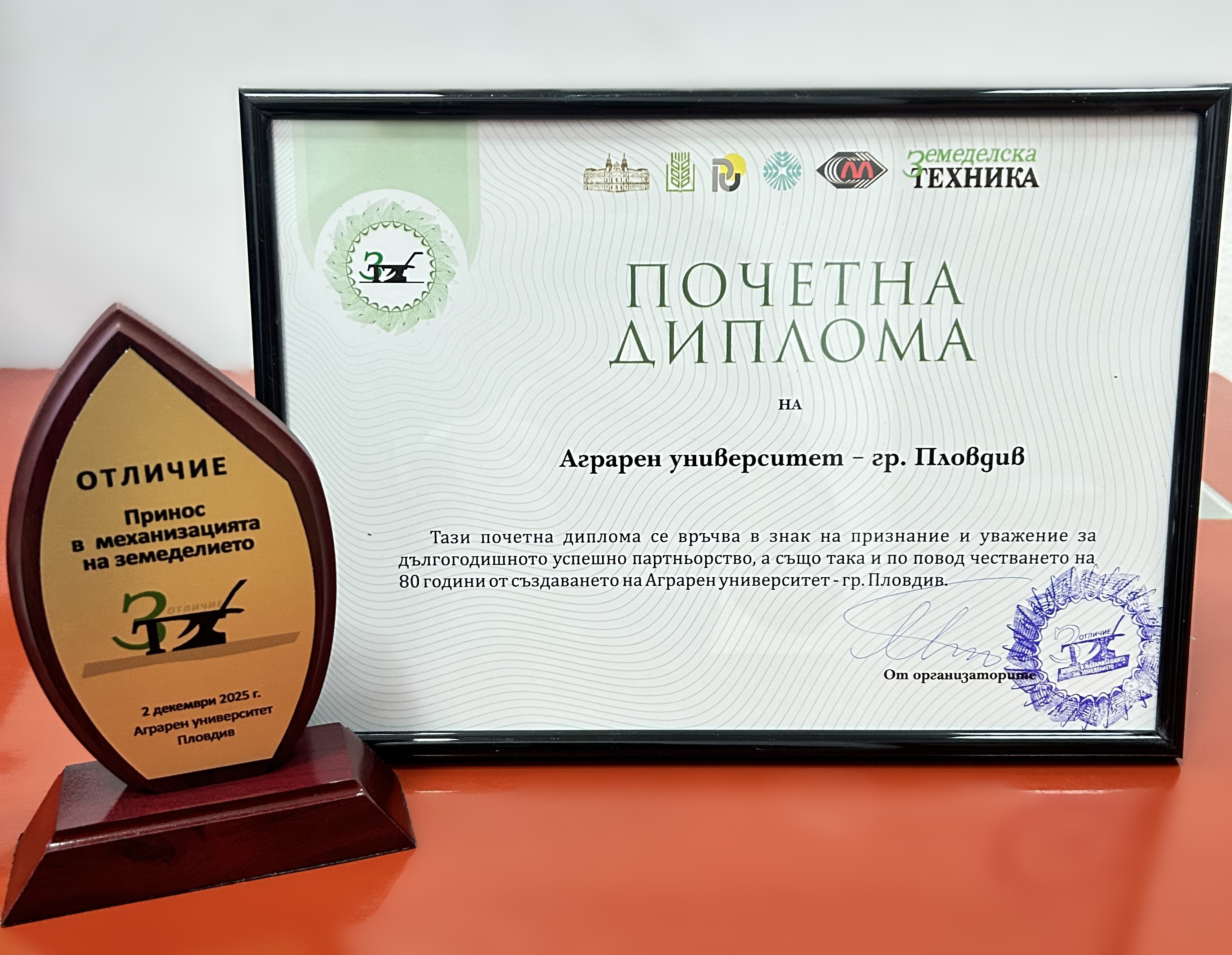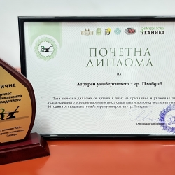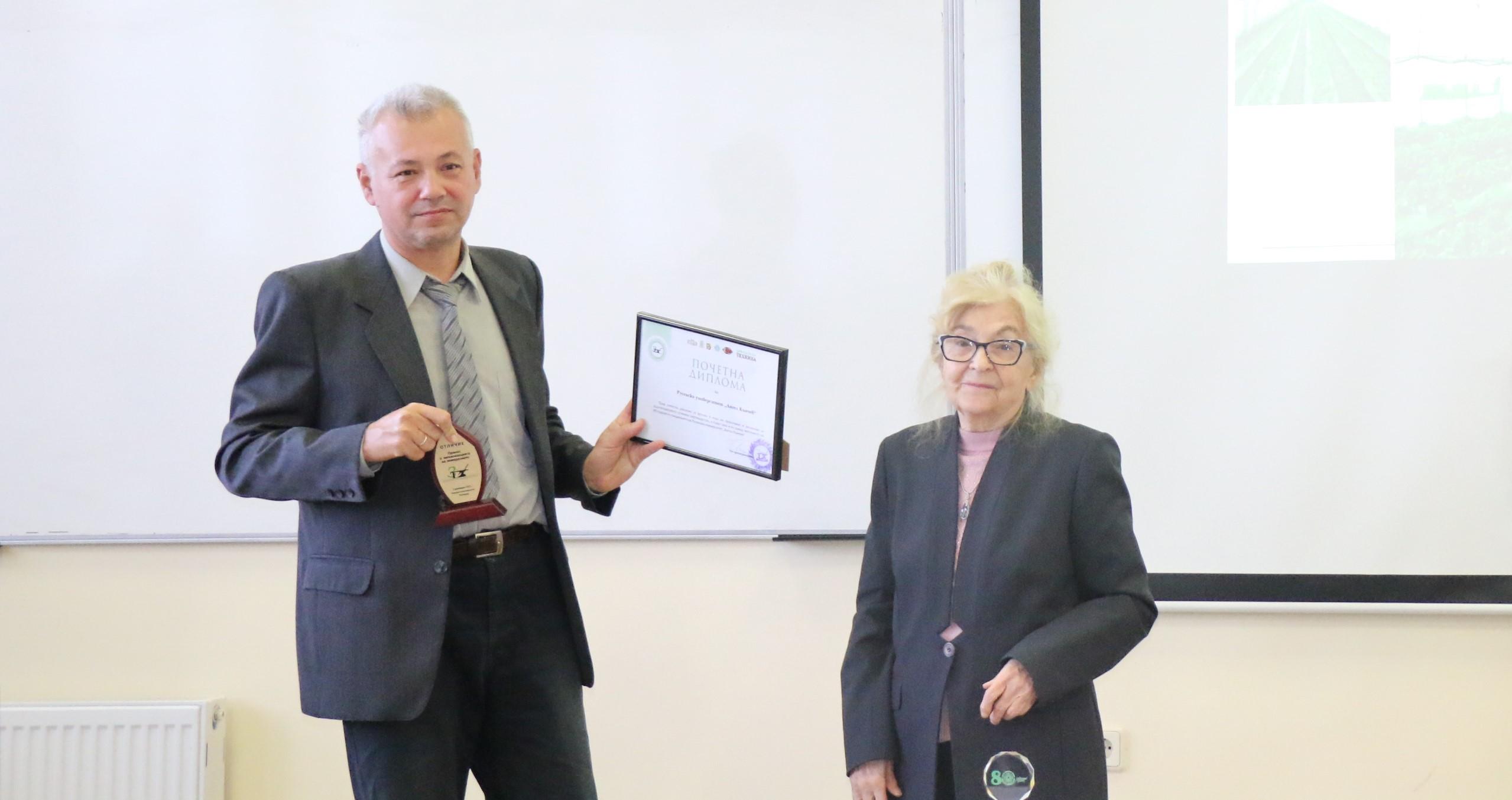 Главният редактор на вестник „Земеделска техника“ доц. д-р инж. Милка Бобева удостои Аграрния университет – Пловдив и Русенския университет „Ангел Кънчев“ с плакет и диплома по повод 80-годишния юбилей на университетите.