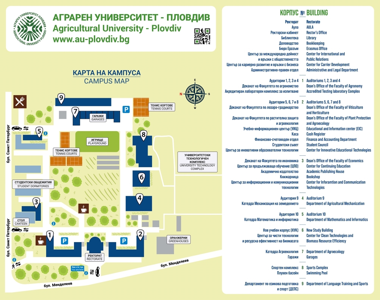 Намиращите се в съседство с учебните корпуси три общежития за студенти с над 800 легла, хранителният комплекс, както и уютните кътове в университетския парк внасят удобство в студентския живот и допринасят за пълноценния отдих на младите хора.
