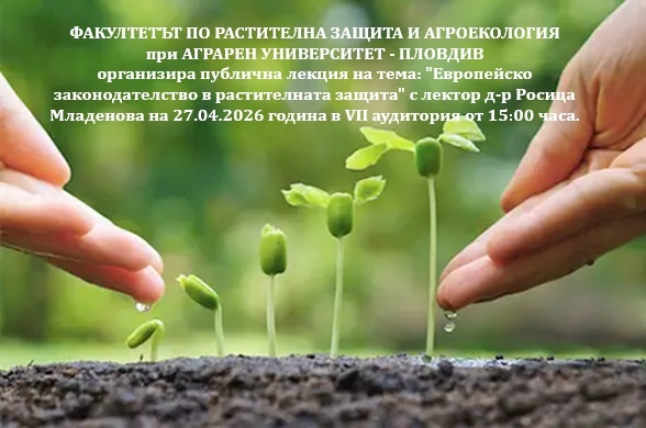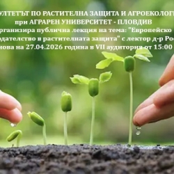 На 27 април 2026 година от 15:00 часа в VII аудитория на Факултета по растителна защита и агроекология ще се проведе публична лекция на тема: "Европейско законодателство в растителната защита" с лектор д-р Росица Младенова.