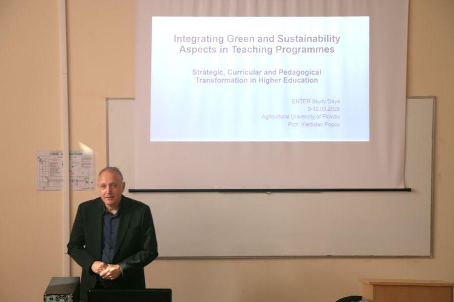 Дните на тема „Европейското образование в преход: дигитализация, интернационализация и иновации“ се проведоха в Аграрния университет - Пловдив по ENTER - Европейска мрежа за учене и преподаване в сферата на земеделието и развитието на селските райони (European Network of Learning and Teaching in Agriculture and Rural Development) и UNIgreen. Събитието беше организирано като релевантна дейност в рамките на Алианса на европейските университети UNIgreen, допринасяйки за обмена на знания и добри практики, свързани с иновациите и трансформацията във висшето образование. Study Days бяха реализирани и във връзка с ENTER, с участието на представители на партньорски институции и академични експерти. Дейностите се съфинансират от Европейската комисия, като подкрепят сътрудничеството и изграждането на капацитет в рамките на Европейското пространство за висше образование.