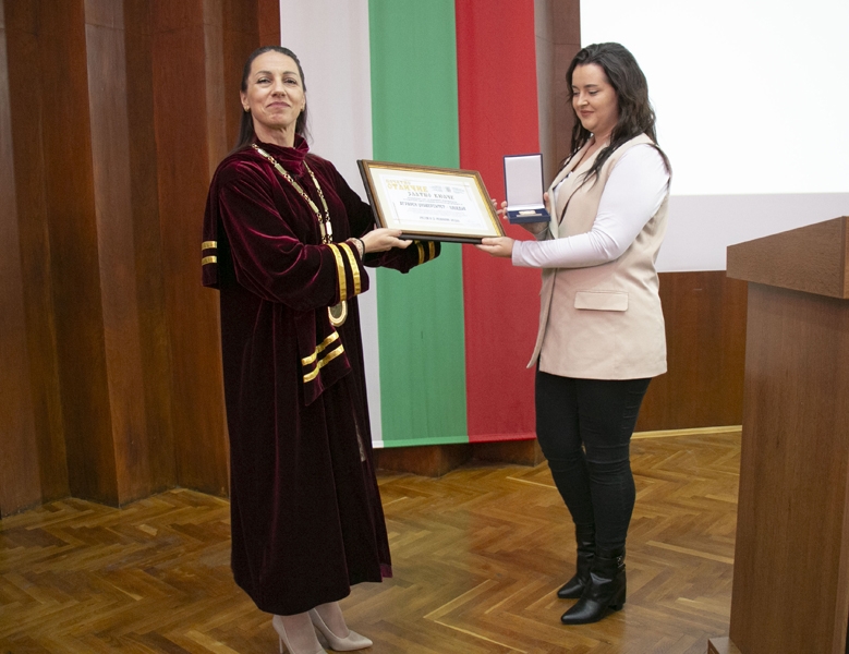 Доц. д-р Боряна Иванова връчи отличията и дипломите на първенците и абсолвентите бакалаври с успех над 5.50 от курса на следване и успех от държавните изпити отличен 6.00.