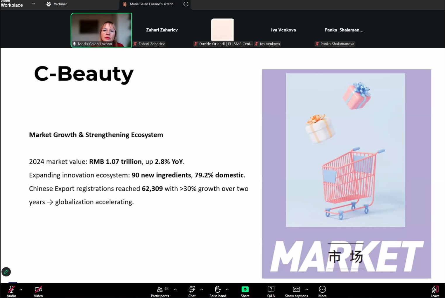 Историята и развитието на китайския пазар на козметика, възможностите за навлизане на пазара, основната нормативна рамка и регулаторните режими за регистрация и нотификация на козметичните продукти в Китай бяха обобщени от г-жа Мария Галан Лосано (María Galán Lozano), която е специалист по регулаторни въпроси, 2 Open Beauty. Г-жа Лосано е консултант и лектор, както и експерт с повече от 20 години опит в областта на иновациите и регулаторните въпроси в сферата на козметичните продукти.